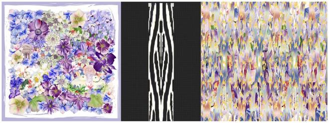 改变,正悄然发生于一次次交流互鉴中。在上海丝绸集团图案设计办公室里,设计师吴斯佳的PS软件页面上纵向排列着三张图片:第一张是已出品的丝巾图案“梦幻花园”,第二张是经典的艾德莱斯纹样,而第三张则是前两者叠合后的效果图,层次更为丰富,意象也愈加交融。